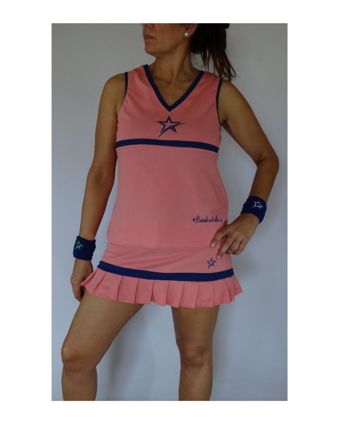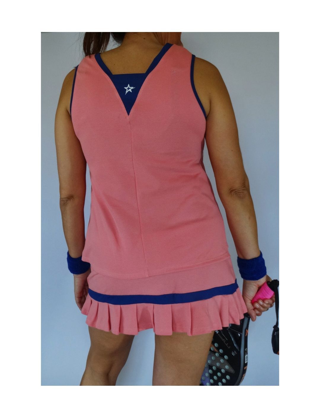 Estilo y comodidad en la pista. Este conjunto, compuesto por camiseta y falda en suave tejido de piqué, destaca por su elegante color salmón combinado con detalles en azul marino. La falda, con delicadas tablas en el bajo, aporta un toque muy chic y femenino sin renunciar al rendimiento.